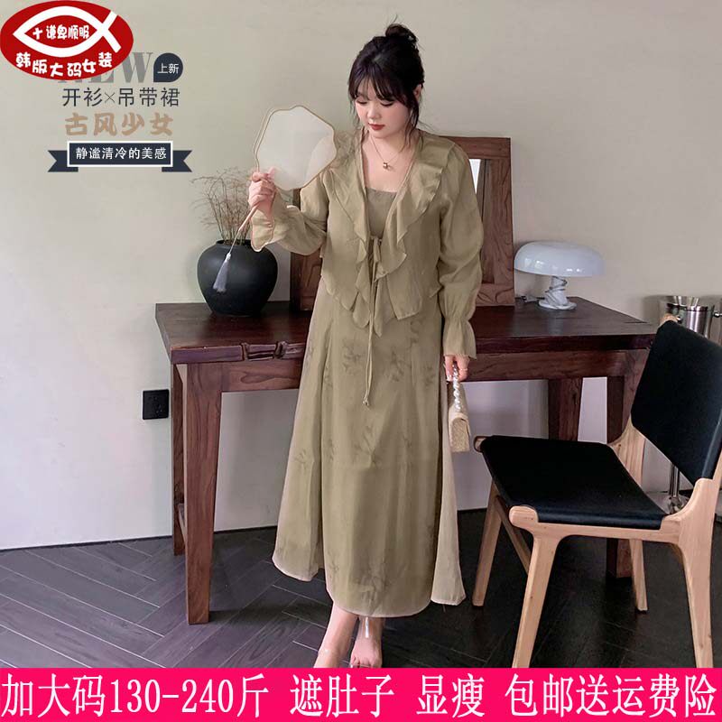 2024春装新款230斤加大码女长裙200胖mm中式开衫吊带连衣裙两件套