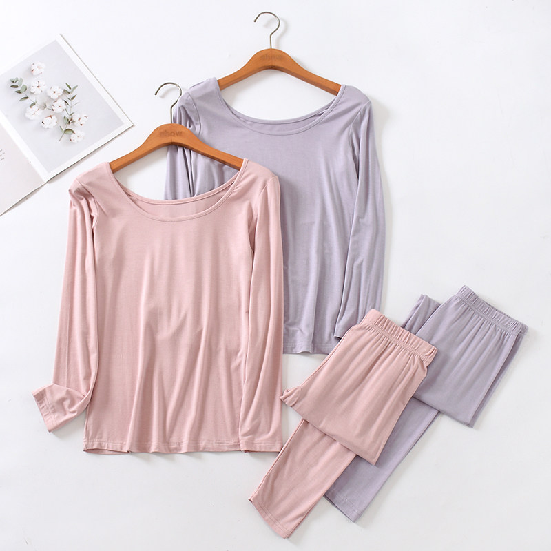 莫代尔秋衣秋裤女薄款套装长袖修身圆领打底衫内搭T恤保暖两件套
