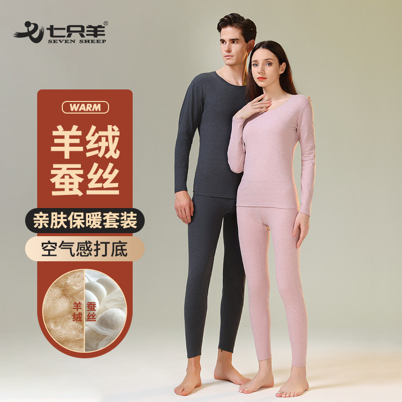 七只羊保暖内衣羊绒蚕丝男士秋衣秋裤女薄打底圆领套装抗静电222