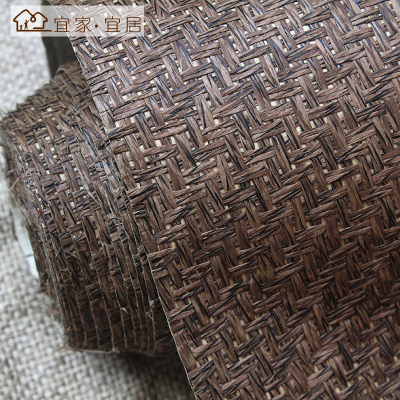 纸编格纹墙纸中式家装深色黑咖啡色书房背景壁纸天然植物草编壁纸