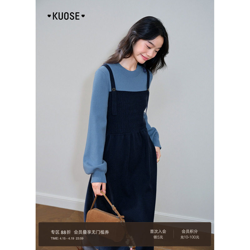 阔色藏蓝色假两件拼接长袖连衣裙2025秋冬季穿搭新女针织毛衣裙春