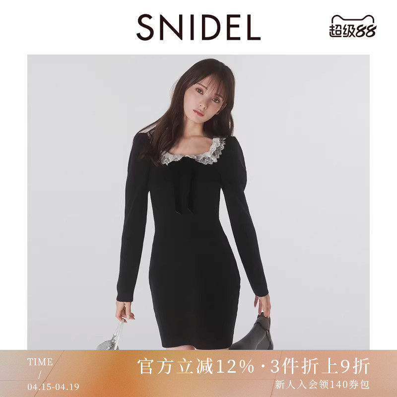 SNIDEL2025秋冬新品蕾丝方领长袖收腰短款针织连衣裙SWNO255175