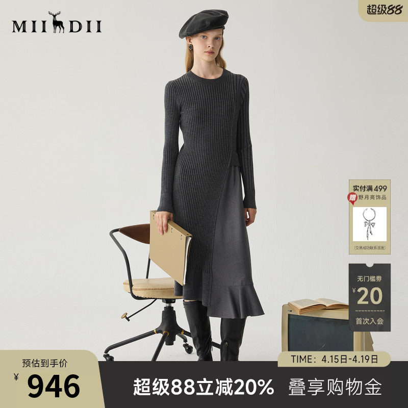 谜底针织连衣裙长袖女冬季新品通勤风修身拼接长裙244MZ1847