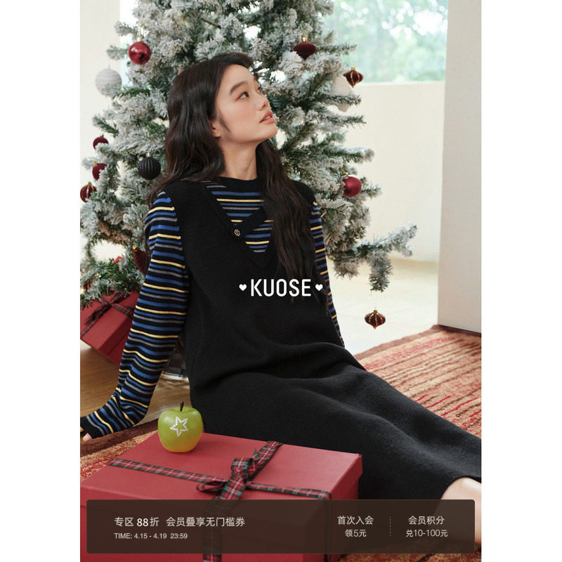 BANANA CICI2025年冬季新款撞色刺绣假两件坎肩长袖A摆针织连衣裙