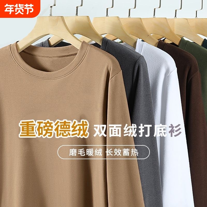 秋冬德绒保暖男士内衣加绒加厚内搭打底衫圆领长袖T恤男双面黑色