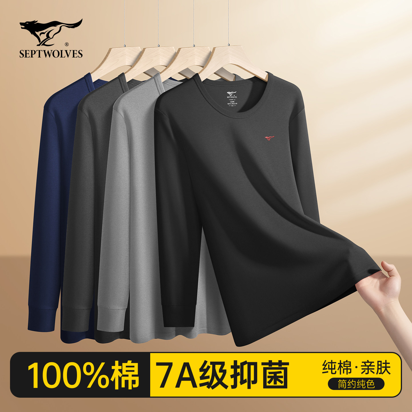 七匹狼秋衣男士纯棉单件上衣全棉保暖内衣男款黑色冬季打底棉毛衫