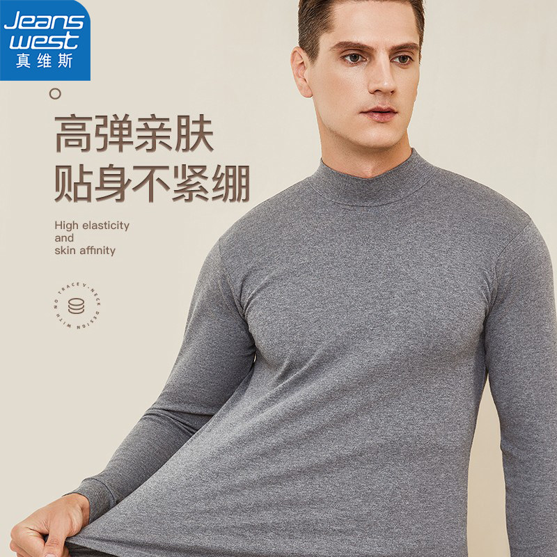 真维斯纯棉男士中领保暖上衣秋冬薄款打底秋衣男款黑色内搭长袖衫