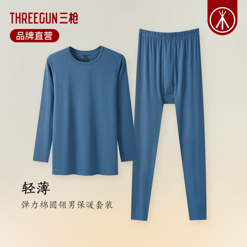 三枪轻薄款男士内衣秋衣秋裤套装纯棉打底衫圆领保暖内衣青年男冬