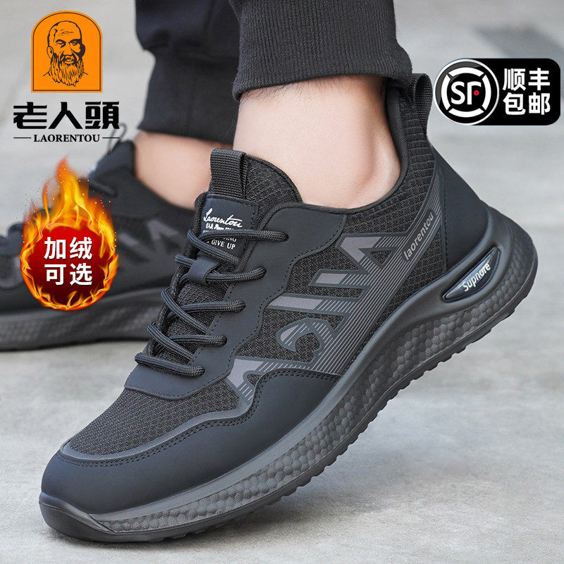 老人头男鞋秋冬加绒运动鞋男士网面鞋减震跑步鞋防滑黑色休闲鞋男