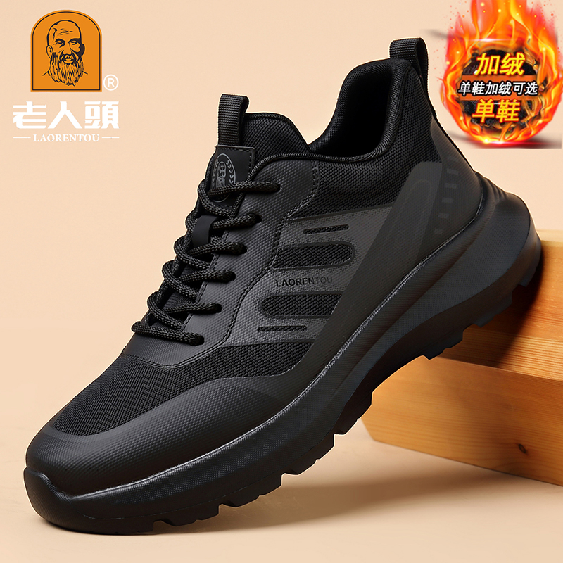老人头男鞋秋冬季加绒棉鞋中年爸爸运动鞋全黑软底公务通勤登山鞋