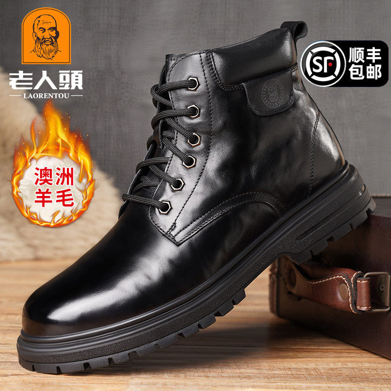 老人头男鞋冬季马丁靴男士保暖羊毛高帮棉鞋真皮厚底户外工装靴子