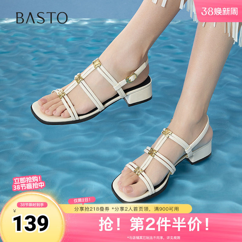 百思图2025夏季新款时尚潮流复古风罗马凉粗跟女凉鞋B5378BL5