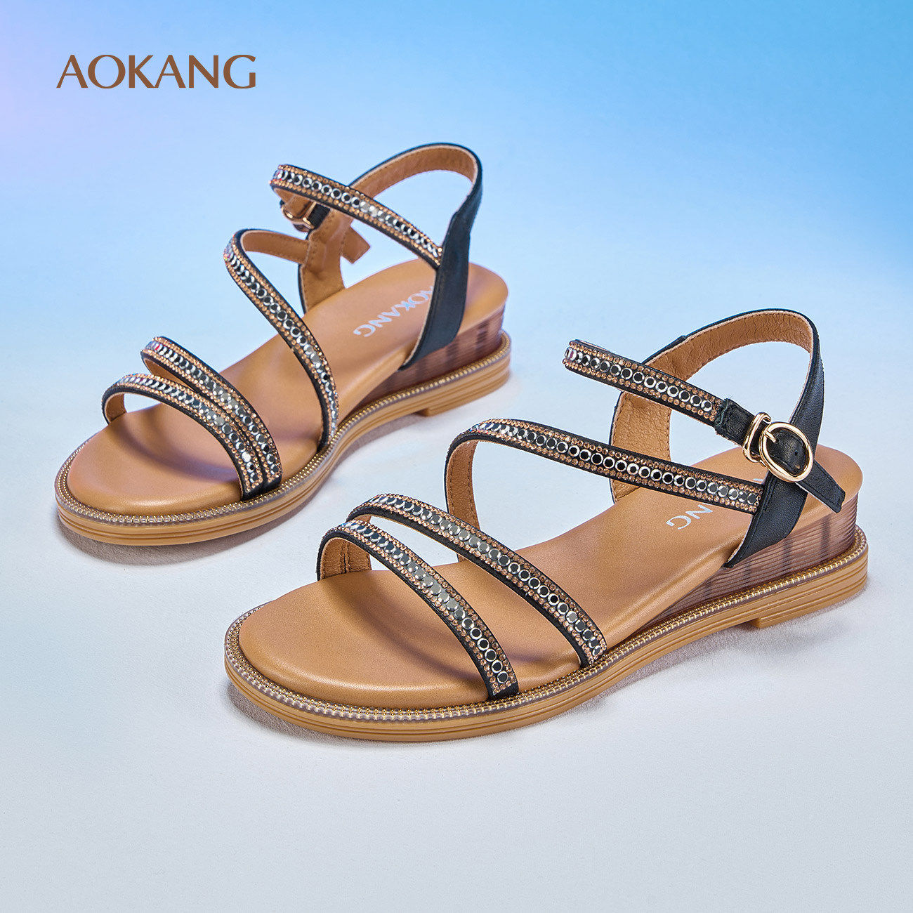 奥康女鞋2025夏季新款度假风休闲凉鞋一字带时尚水钻罗马凉鞋