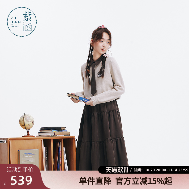 紫涵学院风套头短款针织毛衫翻领无袖连衣裙子两件套装女冬季新款