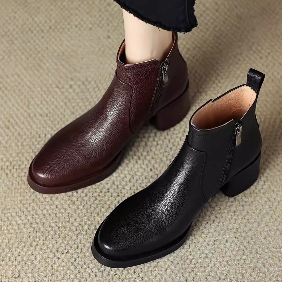 - 圆头拉链粗跟短靴