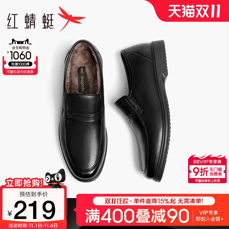 红蜻蜓男士皮鞋冬季新款加绒保暖休闲男鞋真皮中老年棉鞋爸爸鞋子