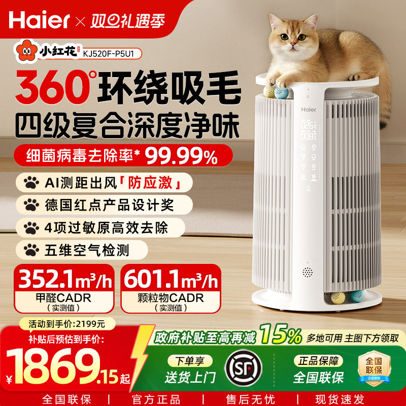 海尔空气净化器家用宠物吸猫狗毛浮毛去除臭异味除甲醛过敏原烟味