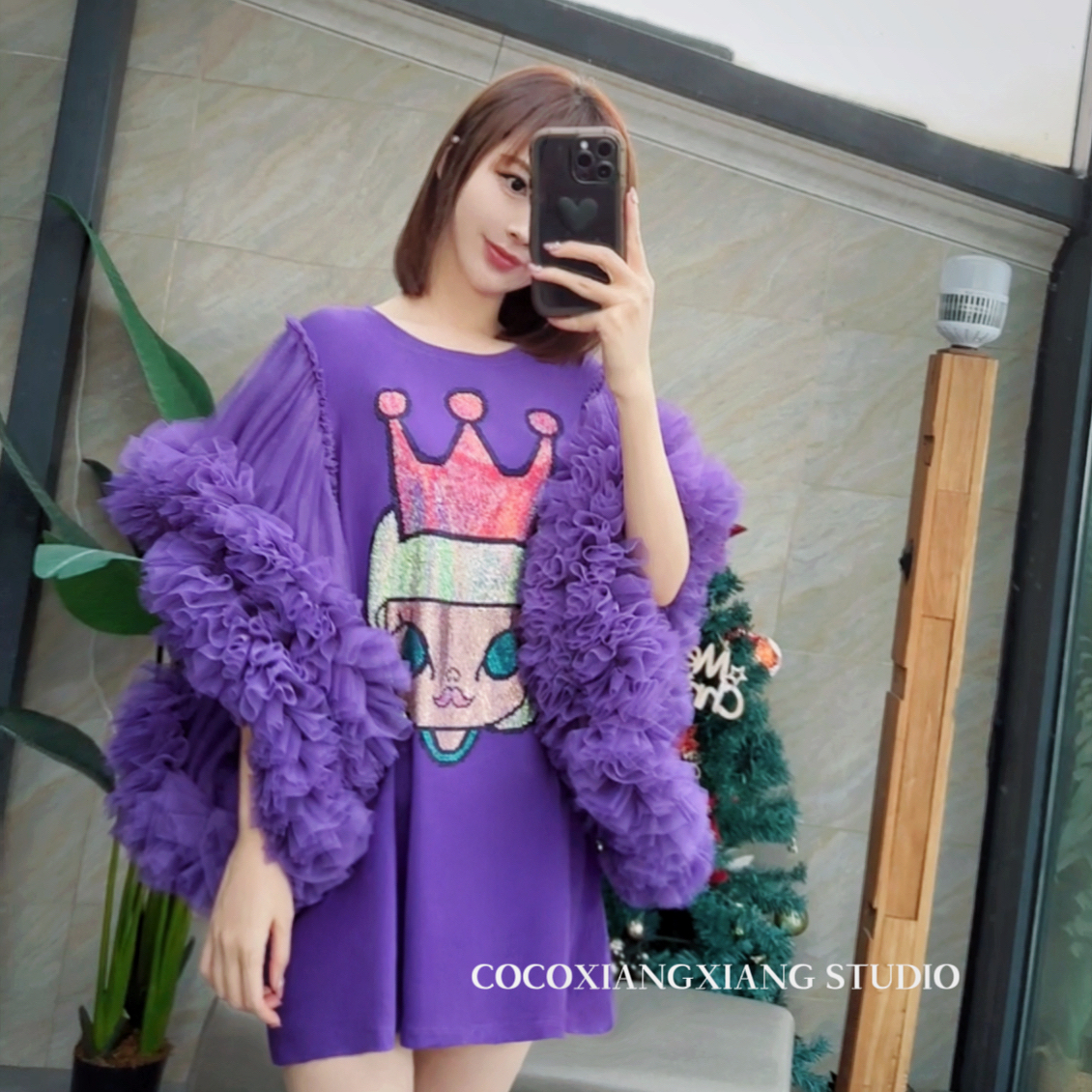 泰国潮牌烫钻小象重工蓬蓬袖网纱拼接可爱减龄宽松中长T恤连衣裙