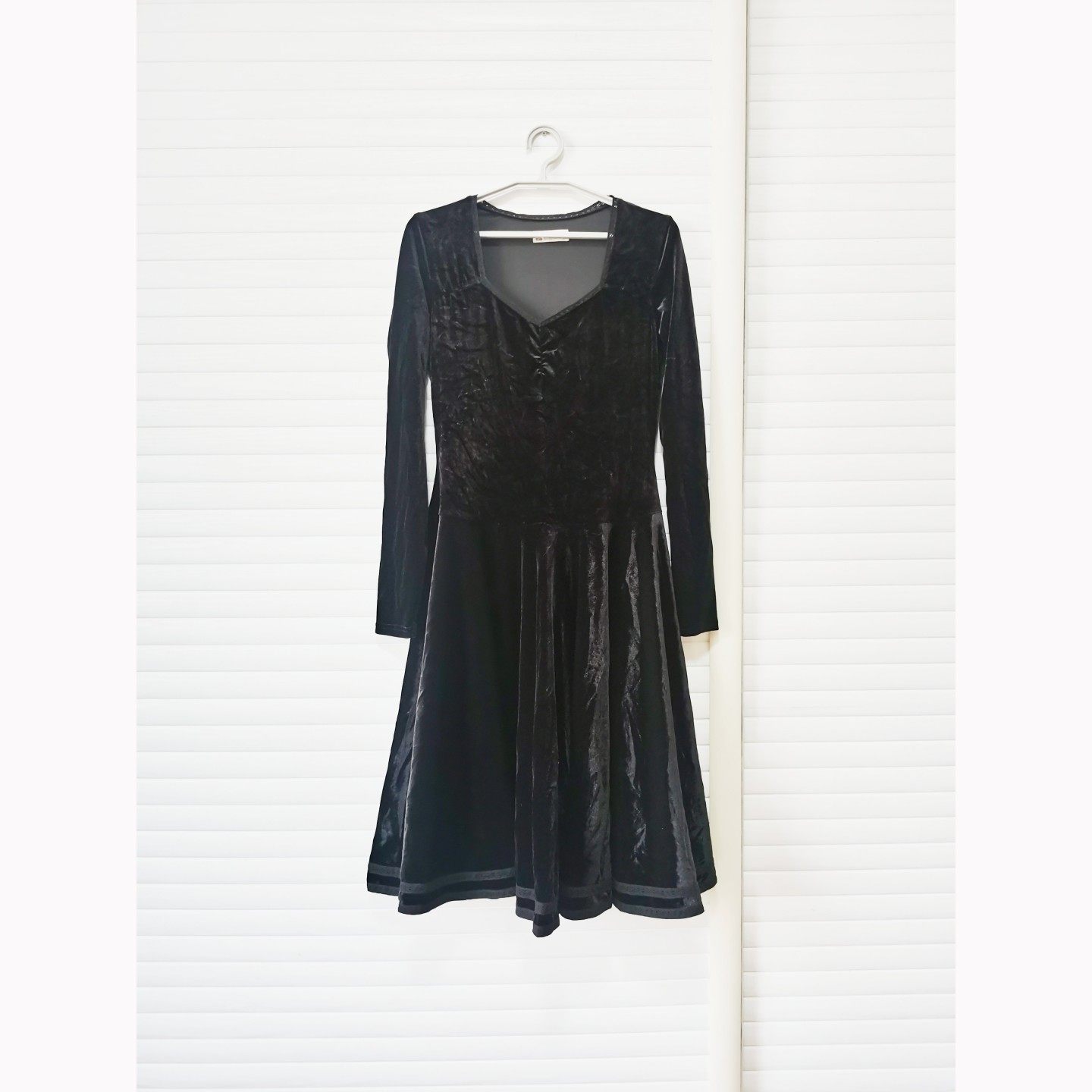 出口欧美外贸原单女黑色丝绒光泽蓬蓬连衣裙长袖方领中长蕾丝花边
