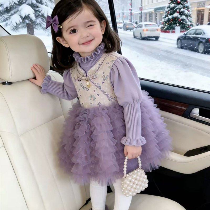 百丽童装女童公主裙2025秋冬长袖连衣裙儿童蓬蓬网纱裙中长款裙子