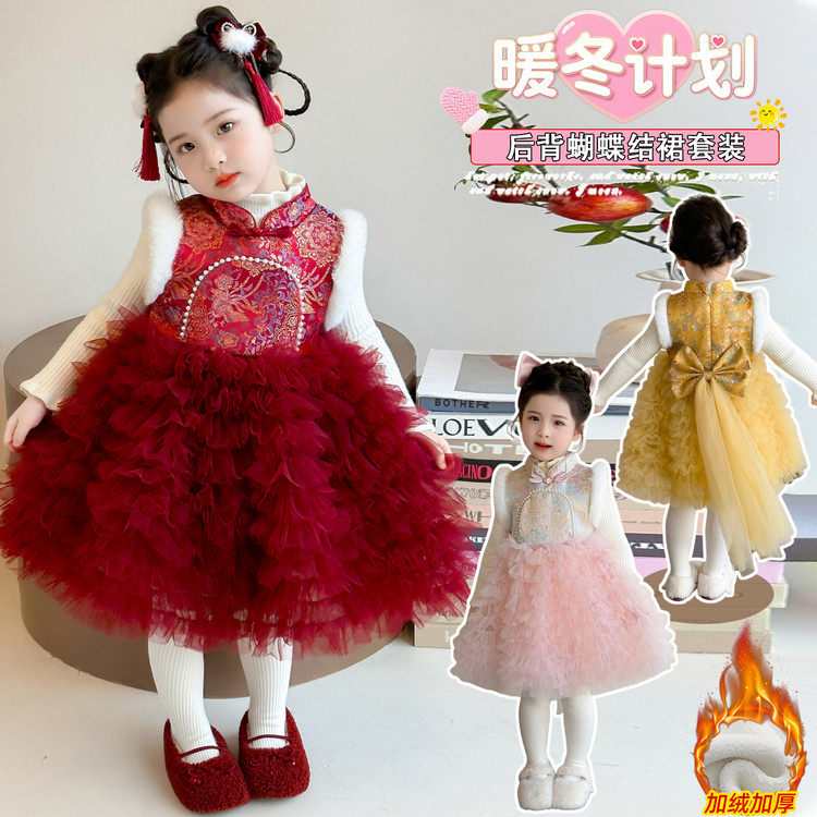 2022春夏新款公主蓬蓬纱裙女儿童加绒礼服花童婚纱中长款连衣裙子