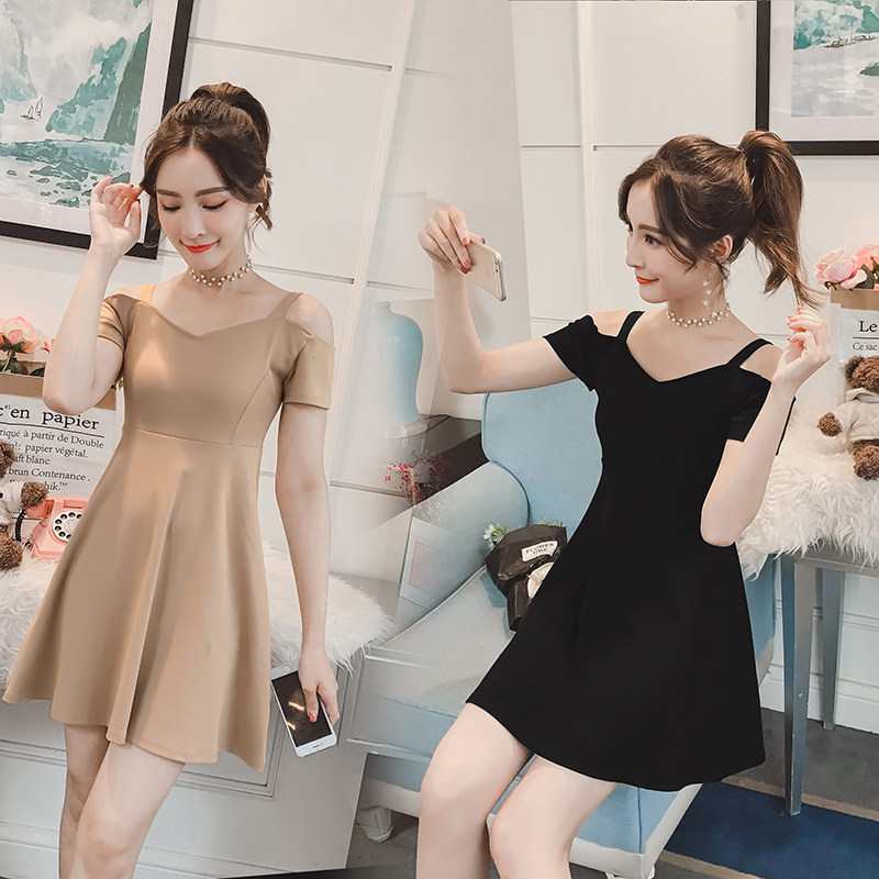 韩版连衣裙中长款2025夏季新款显瘦一字领短袖A字吊带蓬蓬小黑裙
