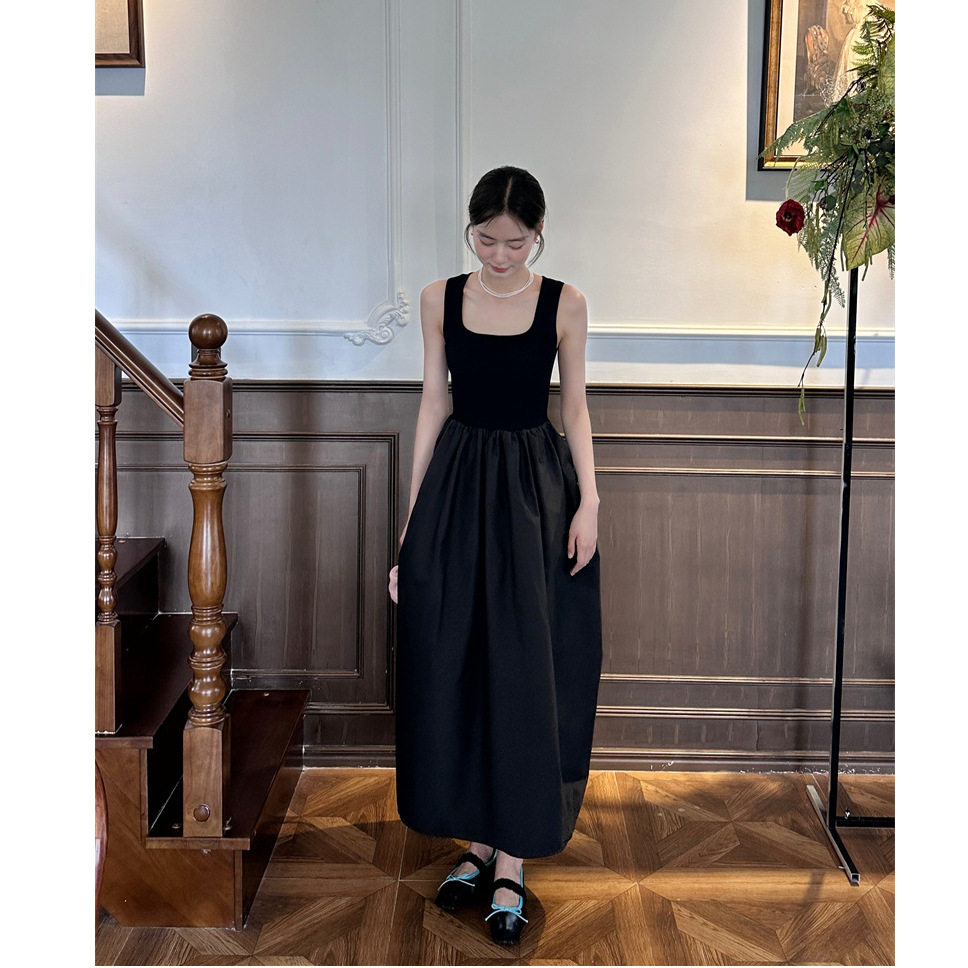 黑色方领连衣裙针织拼接蓬蓬纯色无袖背心中长A字裙高腰显瘦优雅