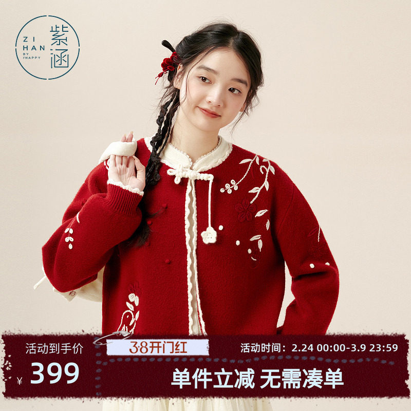 紫涵红色盘扣针织开衫女冬季新款新中式手钩花刺绣灯笼袖毛衣外套