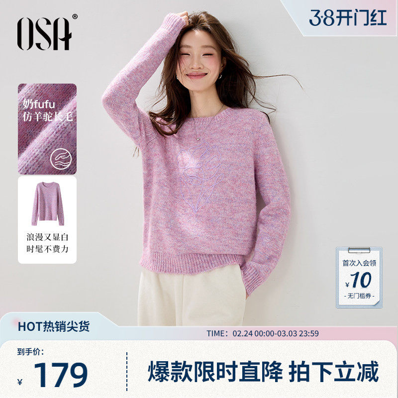 OSA欧莎温柔紫色圆领针织衫女春秋2026新款慵懒宽松刺绣毛衫上衣