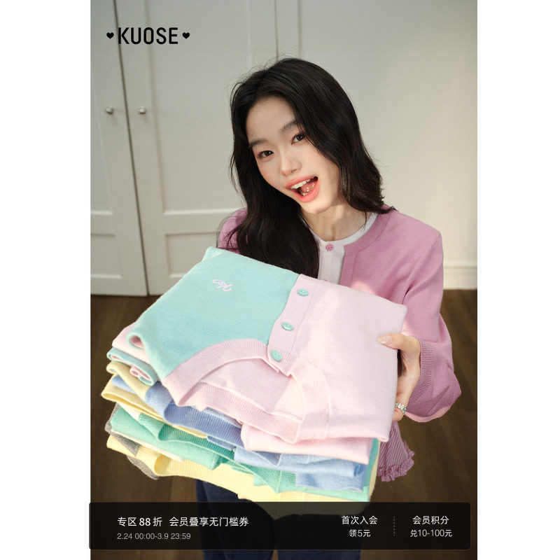 阔色刺绣粉色针织衫长袖上衣女2026春秋季新款撞色毛衣开衫外套黄