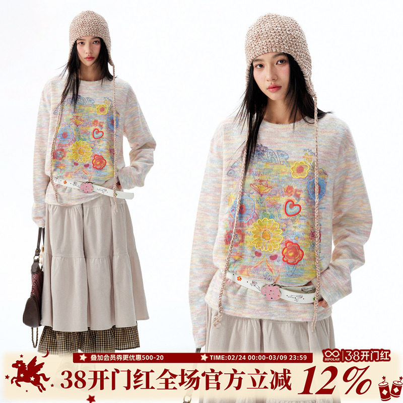 BIPOLAR梦幻花朵长袖针织衫美式休闲宽松上衣春秋款刺绣毛衣女款