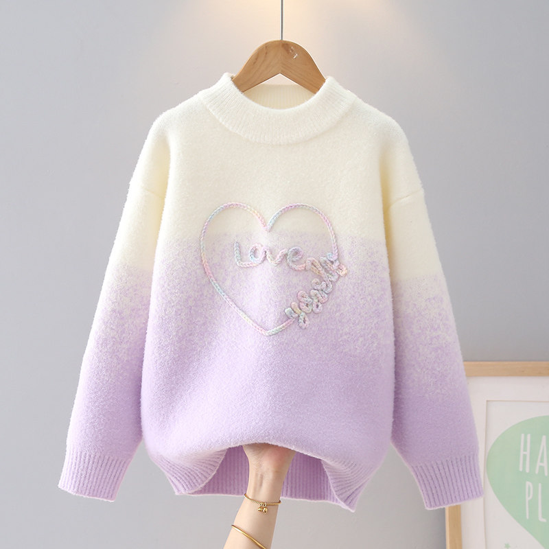 女童毛衣卡通风时尚渐变色爱心刺绣圆领加厚儿童针织衫紫色打底衫