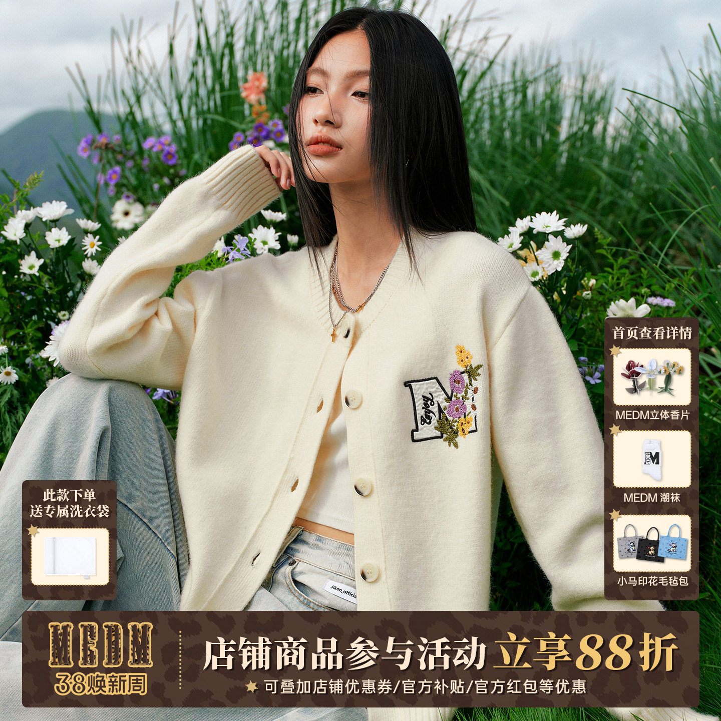 MEDM 线条花卉刺绣休闲开衫毛衣春秋男女慵懒宽松情侣针织衫外套