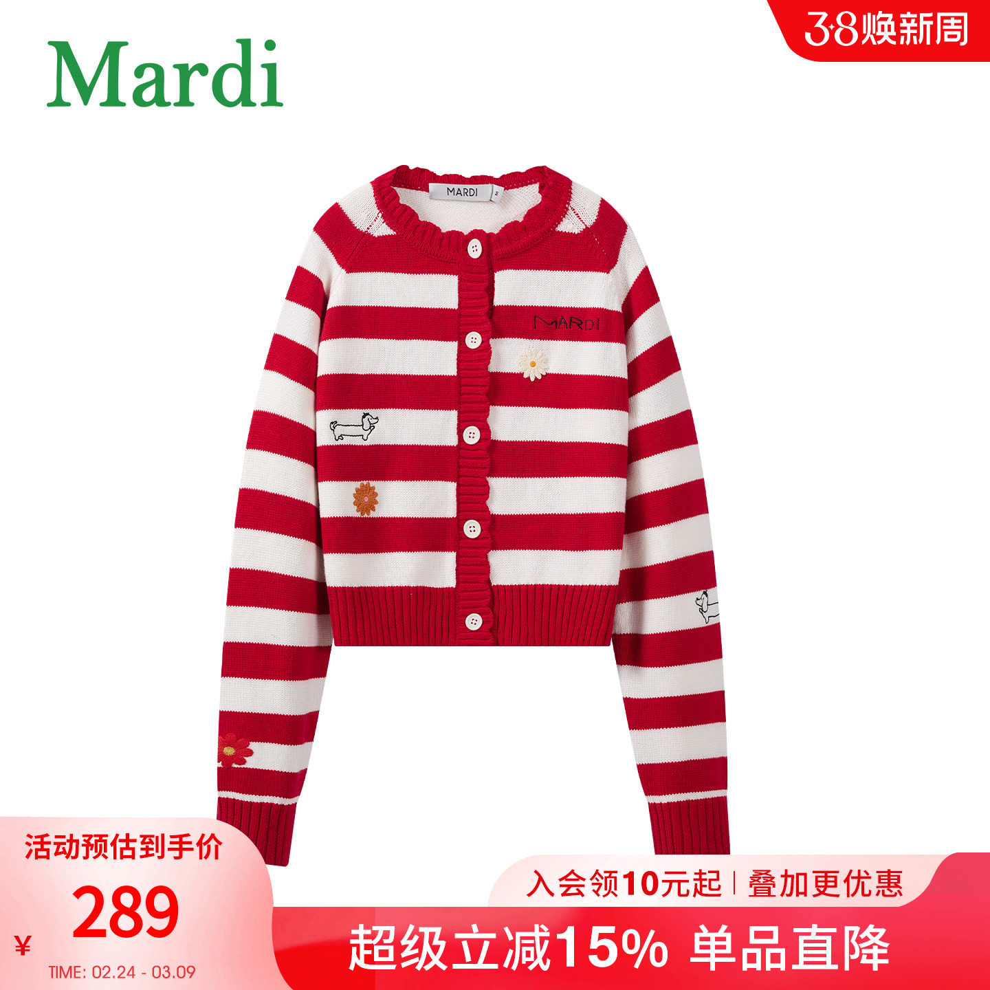MARDI小雏菊毛衣女条纹针织开衫女圆领刺绣休闲时尚外套红色少女