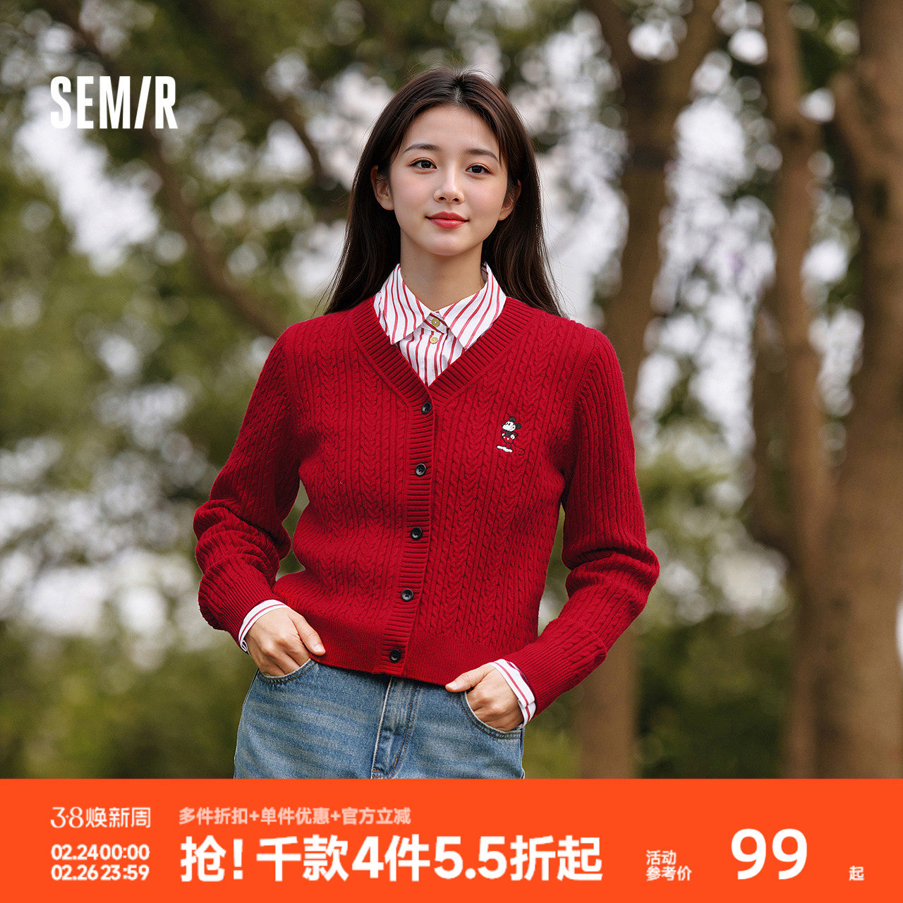森马迪士尼合作系列针织开衫女春季短款V领绞花刺绣毛衫时尚上衣