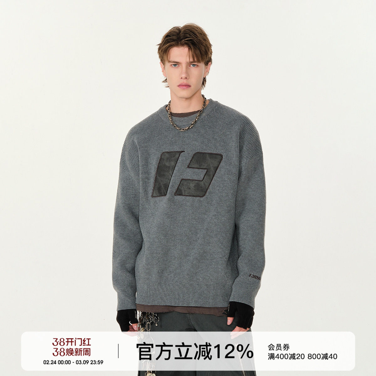 FORNINES贴布刺绣灰色毛衣男女潮牌内搭针织衫秋冬休闲打底毛线衣