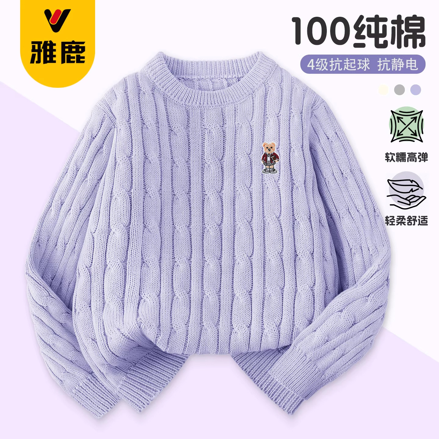 雅鹿女童毛衣针织衫中大童女孩纯棉打底衫薄款紫色刺绣毛线衣春装