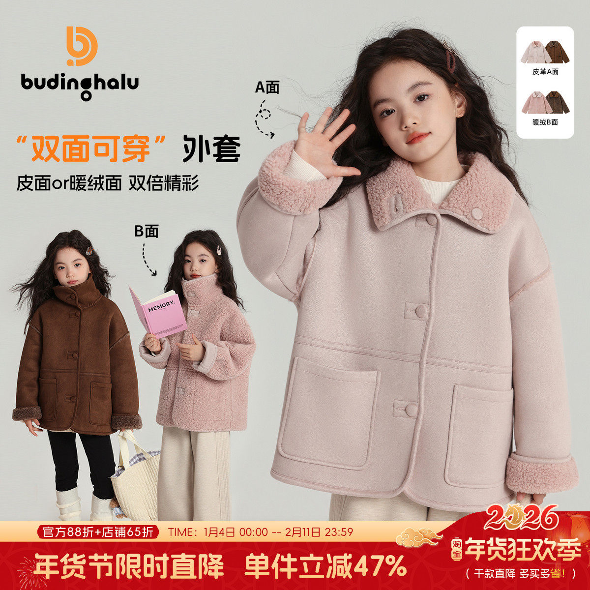 布丁哈鲁冬装童装女童2026秋冬儿童麂皮绒双面穿加绒外套加厚保暖