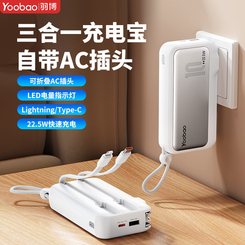 【新国标3C认证可上飞机】羽博2025墙插充电宝AC插头自带线20000毫安超级快充10000毫安移动电源苹果安卓通用