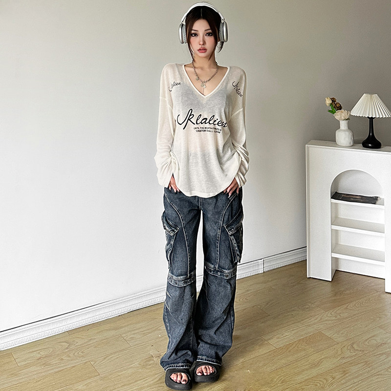 liviahome 美式辣妹白开水穿搭露背宽松T恤女长袖慵懒显瘦打底衫