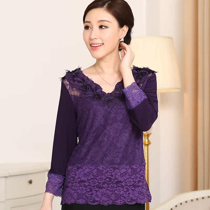 2026春夏新款女装蕾丝上衣洋气中年妈妈装V领小衫长袖宽松T恤女