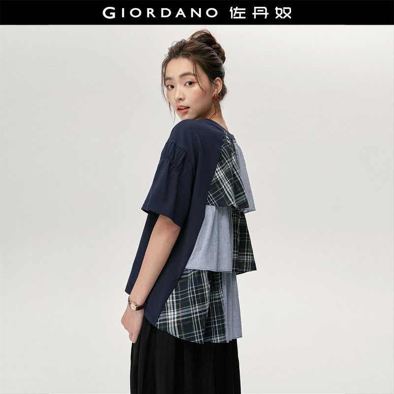 设计师款佐丹奴宽松T恤女拼接后幅格纹条纹圆领短袖T恤女18325815