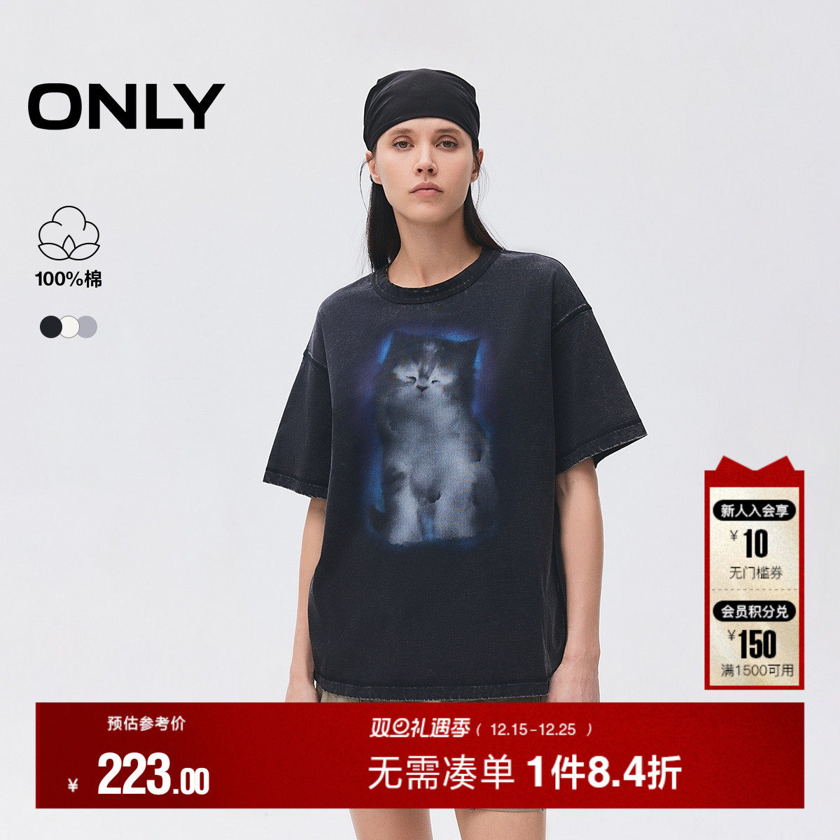 ONLY2025夏季新款可爱宠物小猫图案柔软透气圆领落肩宽松T恤女
