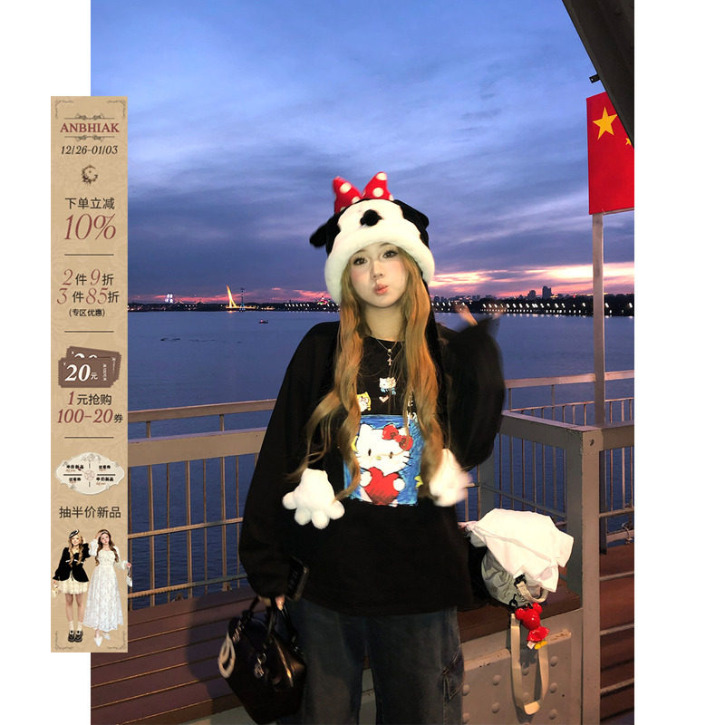 安妮不火 日常休闲kitty印花磨毛宽松T恤女微胖大码宽松长袖上衣