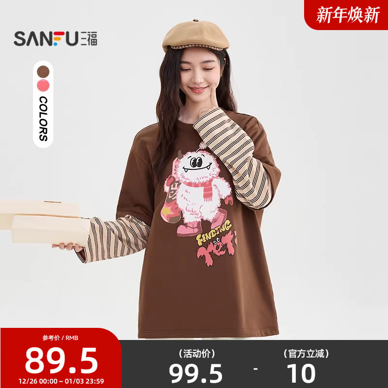 三福长袖上衣2025新款秋季搞怪雪人印花假两件宽松t恤女装512781