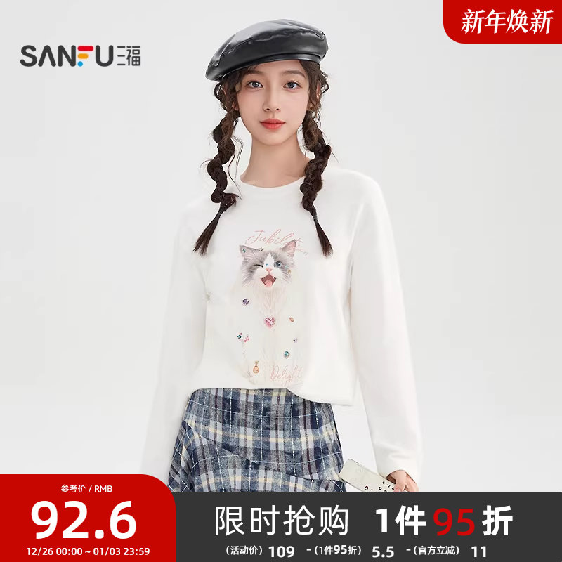 三福长袖上衣2025新款秋季可爱猫咪印花打底衫宽松t恤女装514746