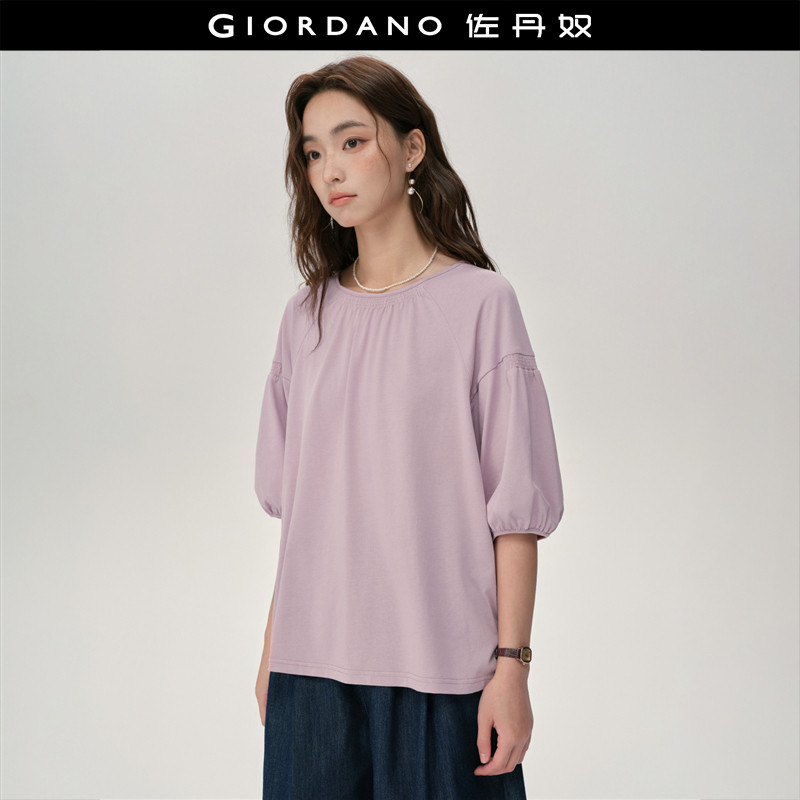 ONLY2025秋季新款拼接落肩衬衫袖螺纹圆领五分袖纯色宽松T恤女