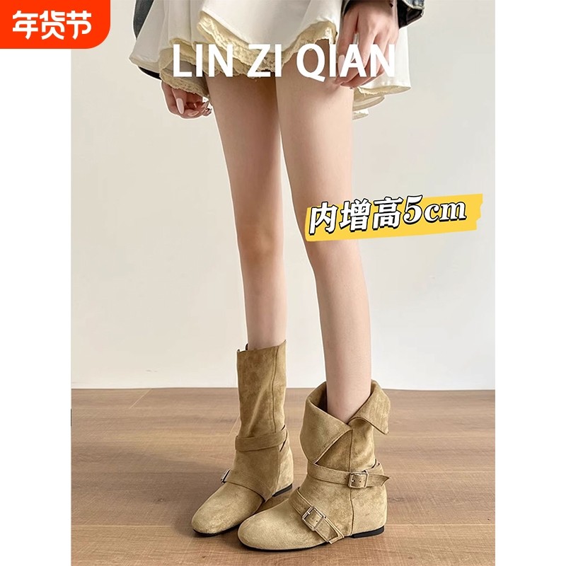 中筒小短靴子女2025新款夏季堆堆靴新疆西部牛仔马丁靴棕色内增高