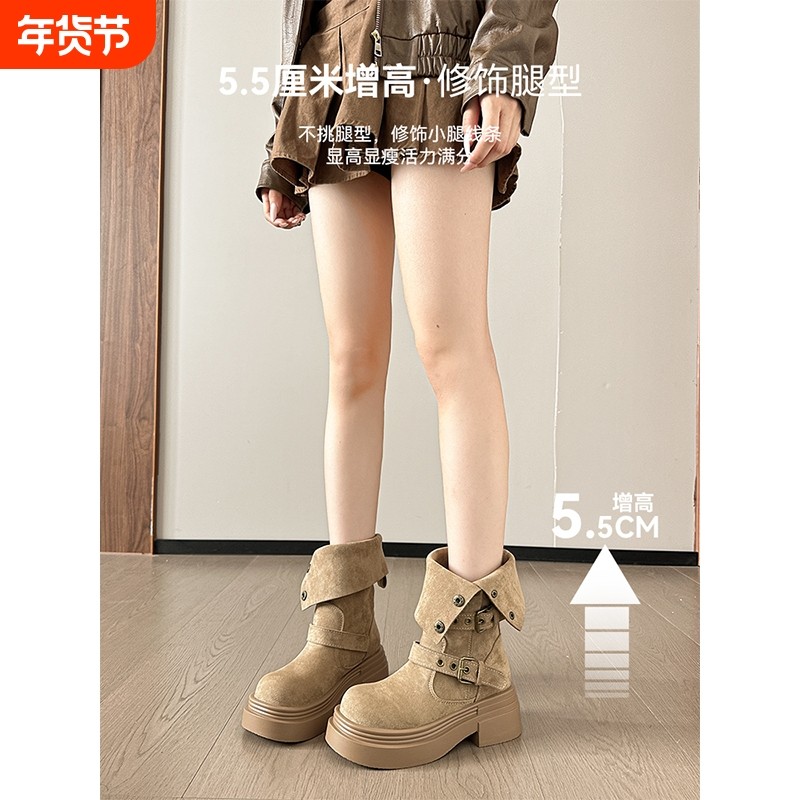 马丁靴女2025夏季厚底骑士靴美短靴修饰卡其色中筒绒面黑色不累脚