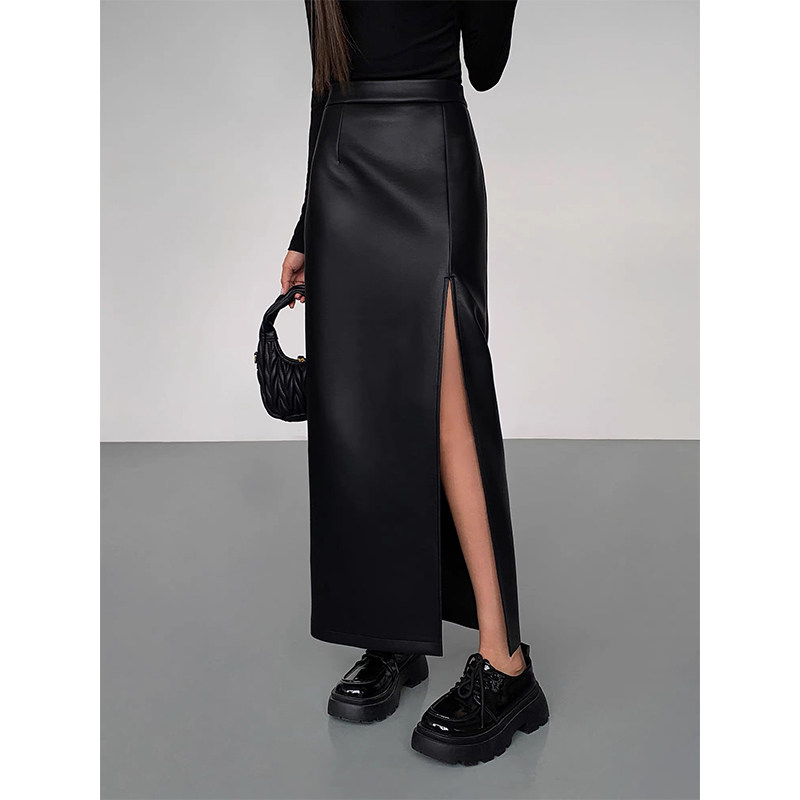 秋冬款设计感小众裙子女性感开叉气质包臀高腰中长款PU皮裙半身裙